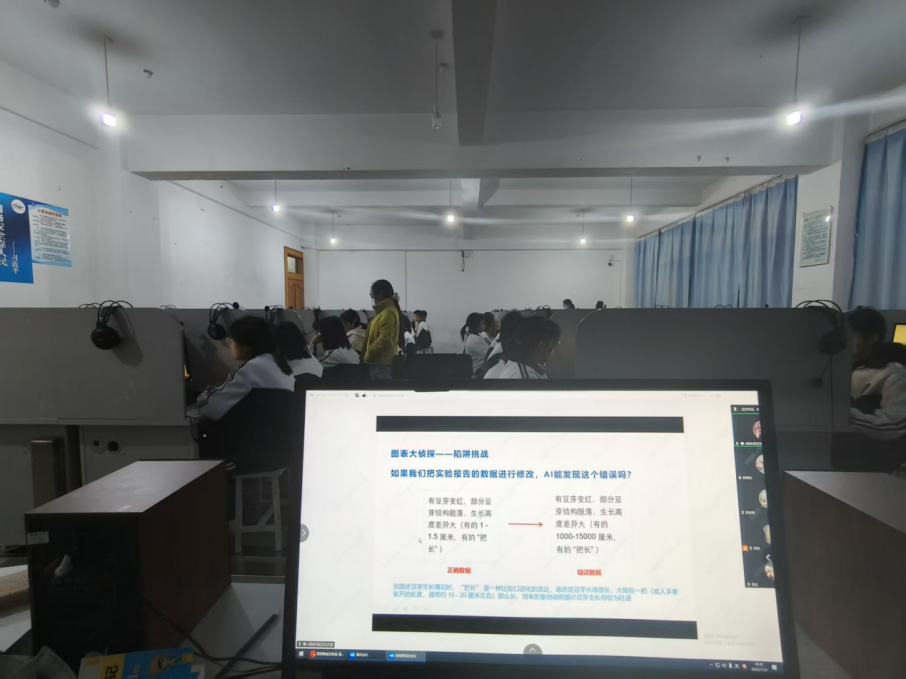 创新探究式教学。区别于传统的理论灌输,支教团设计了“图表大侦探”“AI生成图片”等场景化教学环节,让学生在趣味互动中提升数字素养。例如,在AI数据处理课程中,队员通过展示数据错误报告,引导学生开展“逻辑纠错”挑战。这种“案例拆解+互动验证”的教学模式,不仅让学生直观理解了AI运行逻辑,更有效培养了学生鉴别信息真伪的批判性思维,真正实现了从“学知识”到“育能力”的转变。