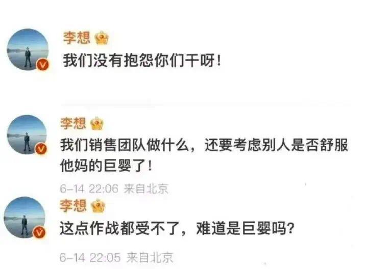 当年李想也怒斥“我们没抱怨你们干呀;这点作战都受不了,难道是巨婴吗;我们销售团队做什么,还要考虑别人舒服吗”。