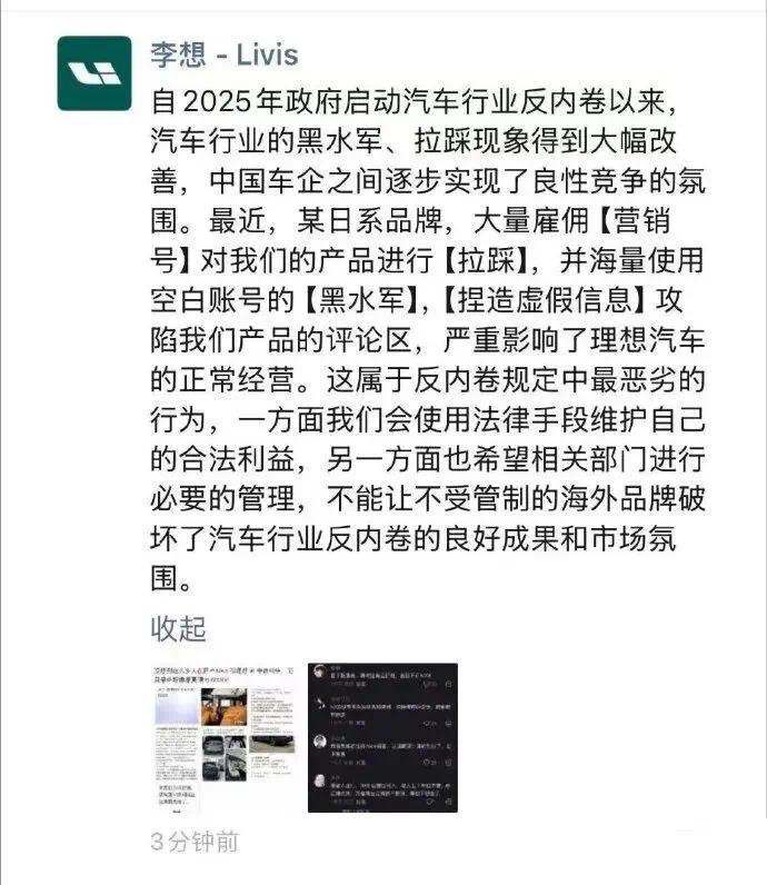 随后,李想发文称:“最近,某日系品牌,大量雇佣营销号对我们的产品进行拉踩,并海量使用空白账号,捏造虚假信攻陷我们产品的评论区,严重影响了理想汽车的正常经营。“