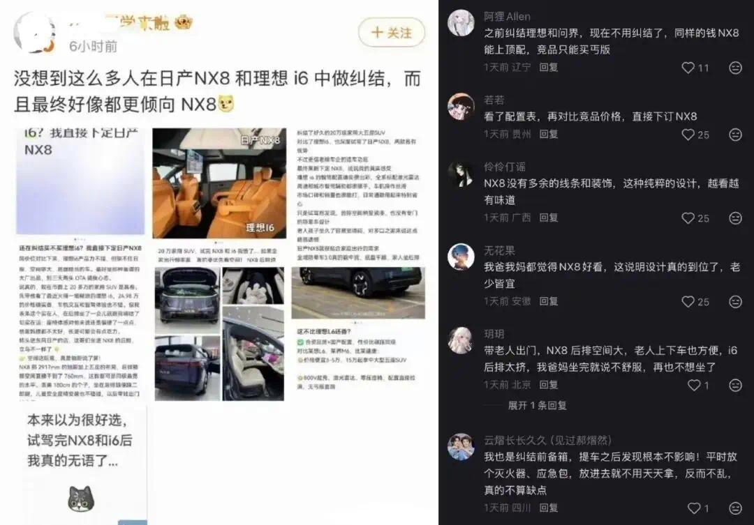 据网络信息,社交媒体平台有博主对比东风日产NX8和理想i6,评论区疑似被NX8水军包围。