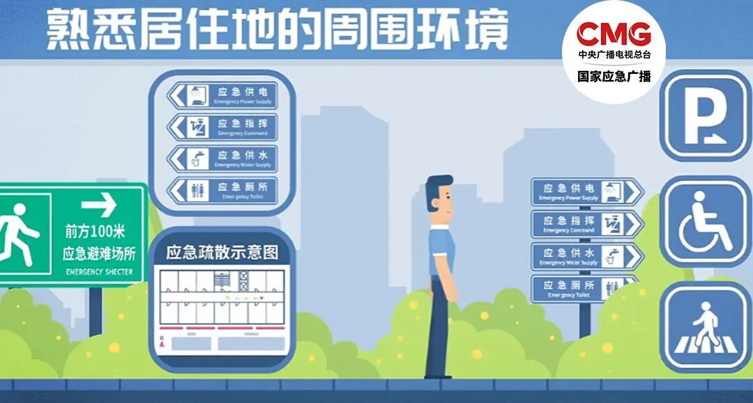 1.熟悉居住地周围环境,出门散步时,多留意社区减灾标志、应急疏散路线、避难场所的出入口等。去外地出差、旅游时,也应提前留意当地应急避难场所的位置和路线。