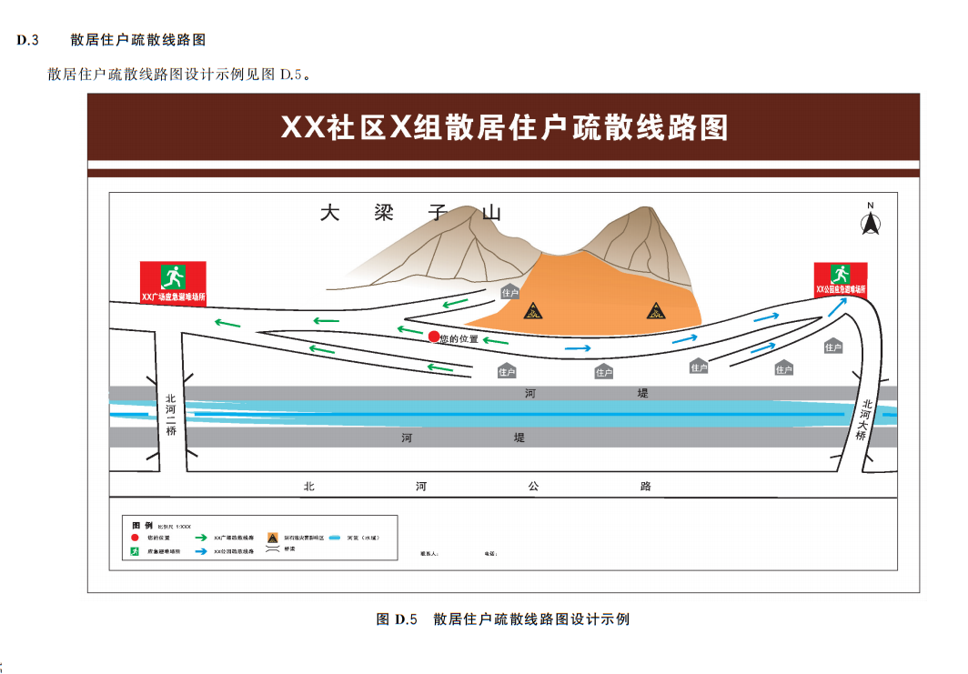 疏散线路图:标明当前区域内向应急避难场所疏散的方向和线路,包括住宅小区(院落)疏散线路图、单元疏散线路图和散居住户疏散线路图。